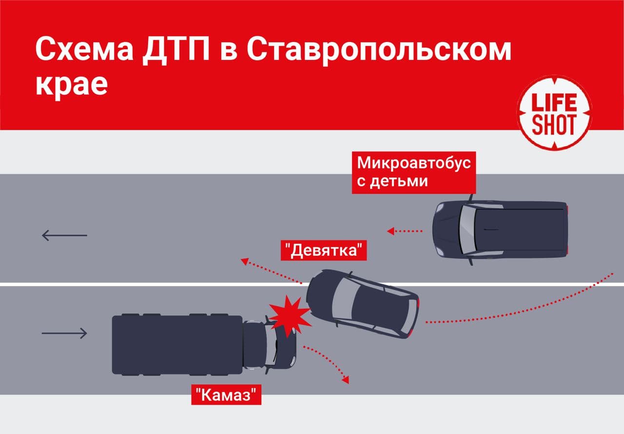 Трагедія сталася в Ставропольському краї. За попередньою версією, навантажений асфальтом “Камаз” зіткнувся з “дев’яткою”, яка пішла на обгін мікроавтобуса, і перекинувся на бус з дітьми.